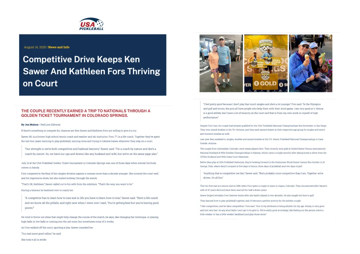 Recently, someone approached Kenny and me on the court and mentioned they had enjoyed reading an article about us. We were pleasantly surprised to learn that USA Pickleball had published a feature on our shared passion for the sport and how competition continues to inspire and energize us.
